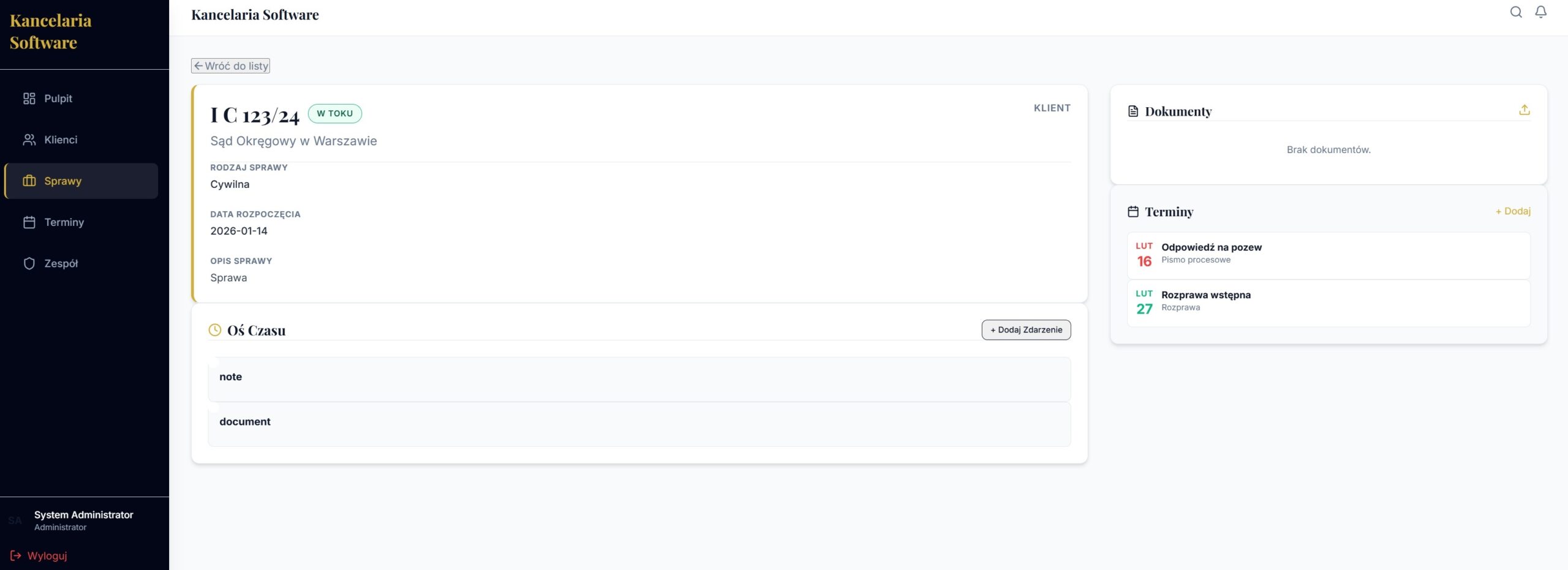 Sercem systemu jest zaawansowany moduł obsługi spraw, który wykracza poza proste katalogowanie. Każda sprawa posiada szczegółową kartotekę („Case Details”), która integruje oś czasu zdarzeń (historię czynności), repozytorium dokumentów oraz listę powiązanych terminów procesowych. Funkcjonalność ta umożliwia błyskawiczne odtworzenie przebiegu postępowania i zapewnia, że żaden istotny dokument czy notatka nie umknie uwadze prowadzącego sprawę.