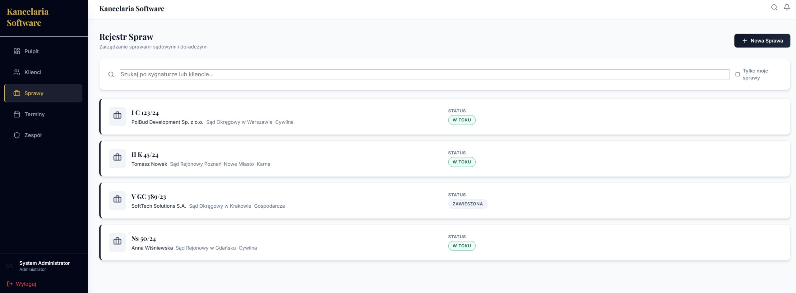 System kładzie również duży nacisk na efektywną współpracę wewnątrz zespołu kancelarii. Wbudowany moduł zarządzania użytkownikami pozwala na przypisywanie ról (Administrator, Prawnik, Aplikant) i kontrolowanie dostępu do poszczególnych sekcji. Dashboard dostarcza kluczowych statystyk dotyczących obciążenia pracą poszczególnych członków zespołu oraz monitoruje zbliżające się terminy sądowe (z systemem kolorystycznych ostrzeżeń o pilności), co znacząco ułatwia zarządzanie ryzykiem i organizację pracy kancelarii.
