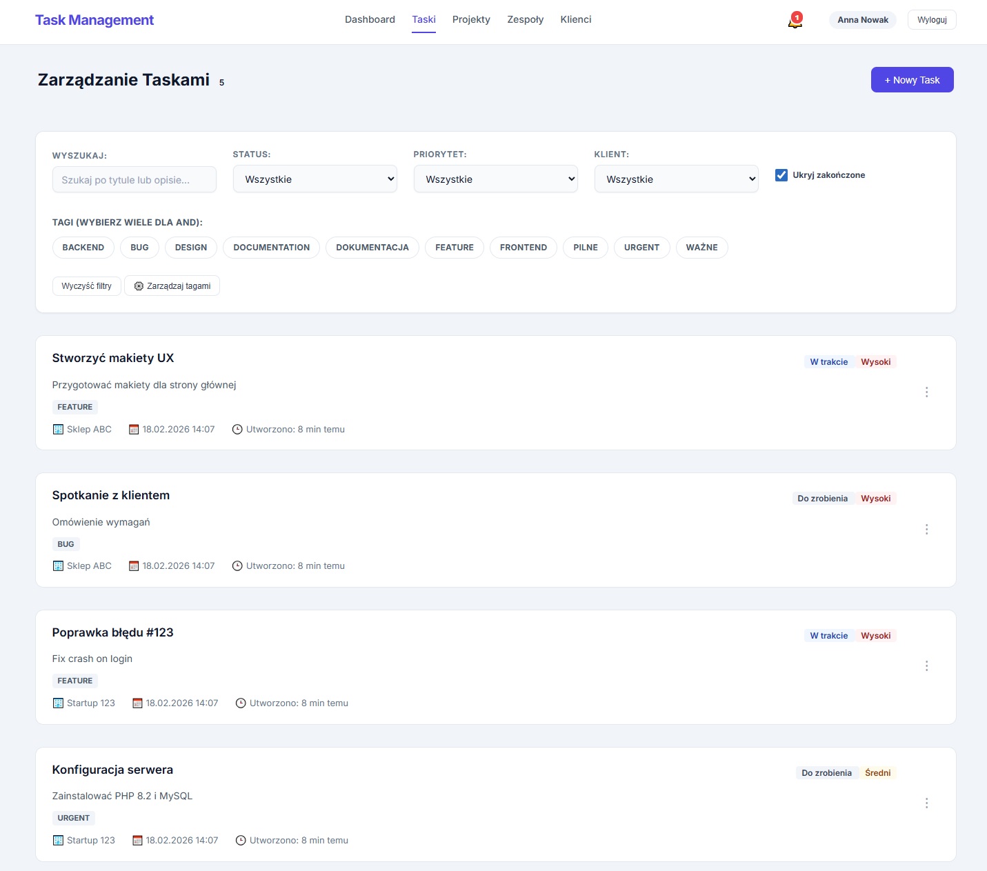 Moduł Zadań to serce całego systemu, umożliwiające tworzenie, edycję i szczegółowe zarządzanie każdym asygnowanym zleceniem. Każde zadanie posiada bogaty zestaw atrybutów: priorytet (niski, średni, wysoki), status, termin wykonania, przypisanego wykonawcę oraz powiązanie z konkretnym projektem i klientem. System wspiera pracę grupową poprzez możliwość dodawania komentarzy bezpośrednio w zadaniu oraz załączania plików, co gromadzi całą dokumentację i dyskusję w jednym miejscu.