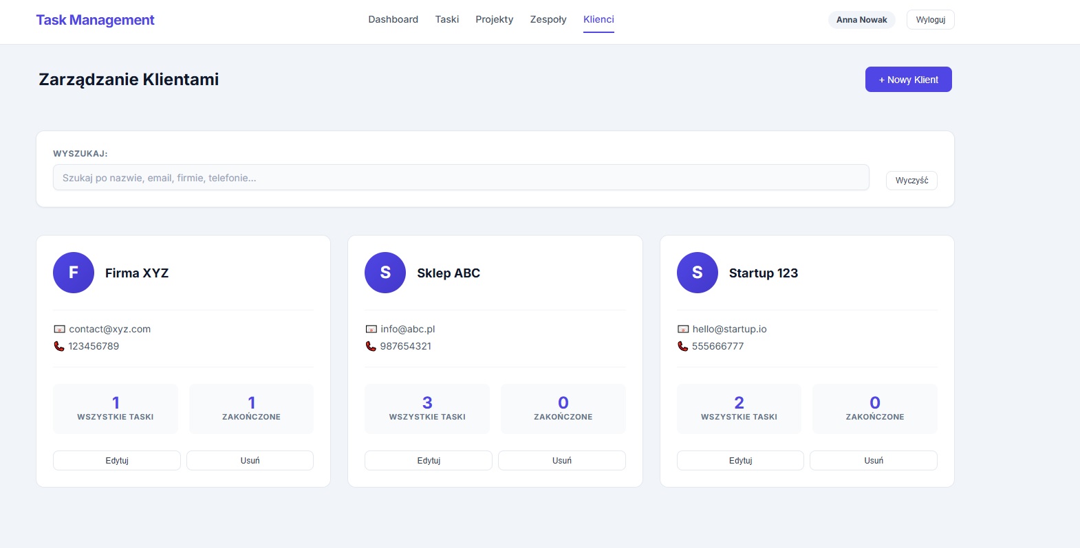 To rozbudowany system do zarządzania zadaniami (Task Management System) zaprojektowany z myślą o efektywnej organizacji pracy w zespole oraz monitorowaniu postępów w projektach. Aplikacja służy do centralizacji wszystkich działań operacyjnych firmy, umożliwiając przypisywanie zadań pracownikom, śledzenie ich statusu w czasie rzeczywistym oraz zarządzanie relacjami z klientami. Dzięki podziałowi na role (Administrator, Manager, Pracownik), system zapewnia odpowiedni poziom dostępu do danych, a wbudowane narzędzia komunikacji, takie jak komentarze i powiadomienia, usprawniają przepływ informacji, eliminując potrzebę korzystania z zewnętrznych komunikatorów.